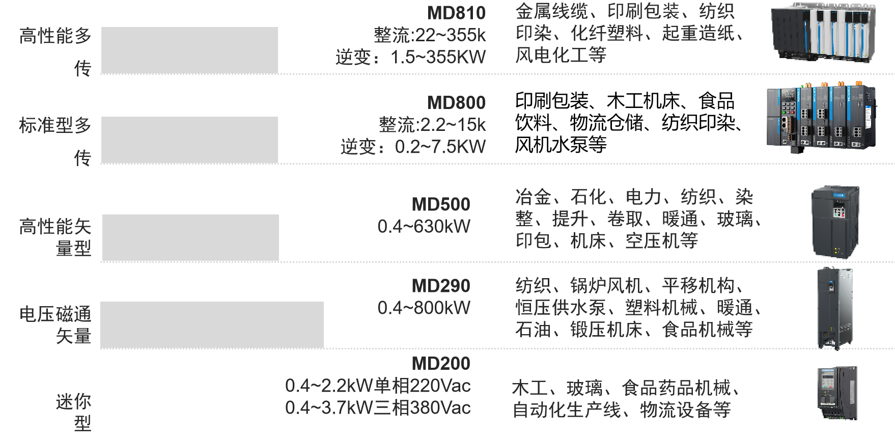 產品介紹 MD200 系列緊湊型變頻器是匯川技術基于小功率、小體積、低成本的市場需求,針對性推出的單相220 VAC 和三相380 VAC 迷你變頻器。MD200 采用V/F 控制方式、無速度傳感器矢量控制方式(SVC),具有高功率密度、高EMC 規格設計、高防護性能等顯著優勢。 產品特性及優點 1、功率密度優秀設計,有效實現產品體積小型化 2、配合全功率段等體積的書本型結構設計,支持在較小空間內無縫并排安裝 3、高標準 EMC 設計,內置 C3 級濾波器,有效降低對外干擾,滿足精準控制需求 4、全封閉外殼 + 獨立風道設計,更大程度隔絕粉塵,保證電子元器件長期穩定運行 5、支持 Modbus / CanLink總線通訊,輕松實現工業自動化組網 6、更大的額定電流設計,過載電流更大,加速時間更短 7、內置行業專業宏應用,支持一鍵設置行業參數 產品介紹 MD810 標準型多機傳動變頻器是匯川新一代低壓多點傳動系統,突破了國外多點傳動的技術堡壘和壟斷格局,推動了多傳變頻產品在中國OEM行業的前端應用。匯川MD810 與AM610 / H3U 等PLC 高速總線組網,實現一網調試,一網驅控,兼容異步及同步伺服電機,搭載23 bit 絕對值編碼器,打造更強變頻驅動。 產品特性及優點 1、MD810 功率范圍:整流單元 22 ~ 355 kW,逆變單元1.5 ~ 355 kW,具備單雙軸兩個版本,雙軸二合一性價比更高 2、全總線支持:EtherCAT、Profinet、Profibus-DP、CANopen、CANLink、Modbus 等 3、編碼器支持類型:① 增量式;② 23 位絕對值;③ 增量式 / 旋變+ 分頻輸出;④ 增量式+ 增量式 / 23 位絕對值 / 正余弦 / SSI+ 分頻輸出 4、高效配電的共直流母線設計,提升系統電能效率,實現5% ~ 30% 節能 5、等高等深書本型模塊設計,實現并排緊湊安裝,柜體利用率高,占地面積小,電氣一體化成柜可實現移動機載 6、每個模塊單元內置Mini型旋轉搭片式母線連接方式,將部件集成到較小空間,減少冗余系統器件,降低配電成本 7、自適應調試,一網連接,5 分鐘完成整線調試 8、標準軟件集成張力控制、同步控制、定位控制等 10 余種高端工藝,應用宏 9、變頻 + 伺服一體化應用,可實現 1 圈 800 萬脈沖絕對值定位控制